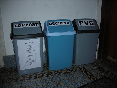 Le tri pour le compost prend également forme avec nos trois petits poubelles dans la cuisine. Le composteur attend dans la cour. Je dois encore le déposer dans le jardin.